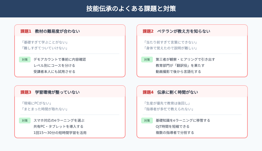 技能伝承で最も多い失敗が、教育内容と受講者レベルのミスマッチです。