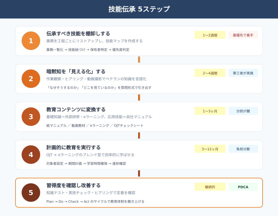 技能伝承を成功させるには、「いつか始めよう」ではなく、今日から始められる具体的なステップに分解することが重要です。