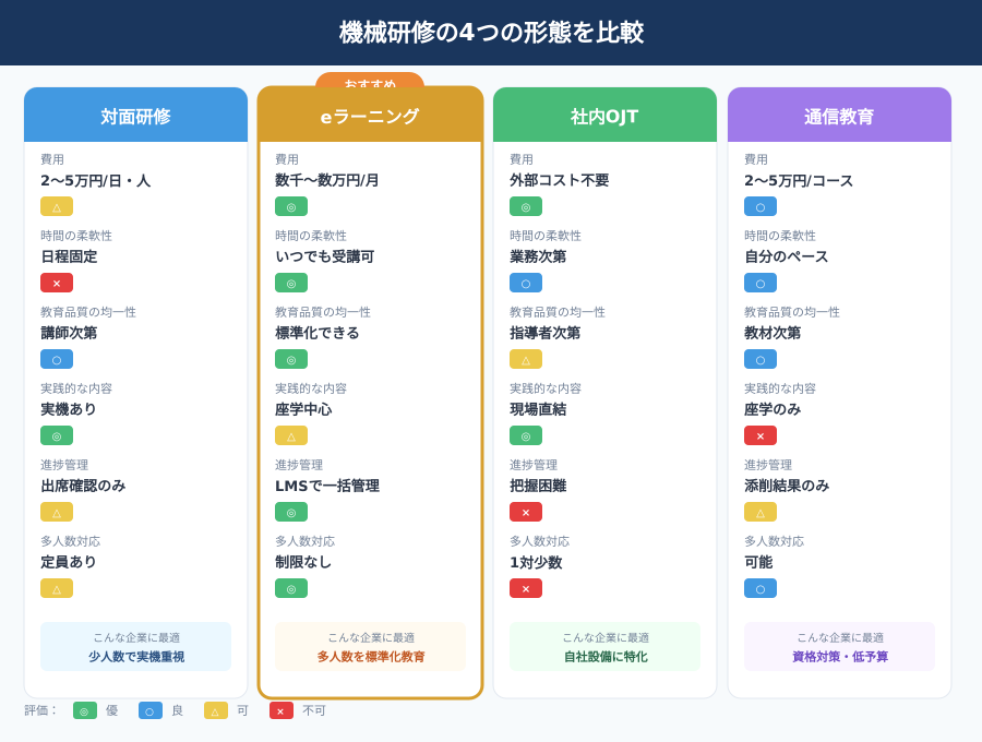 4つの研修形態を、製造業の教育担当者が重視するポイントで比較します。