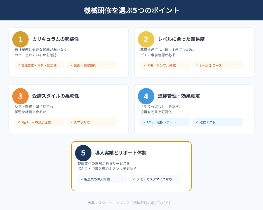 機械研修を選ぶ際の5つのポイントをおさらいします。