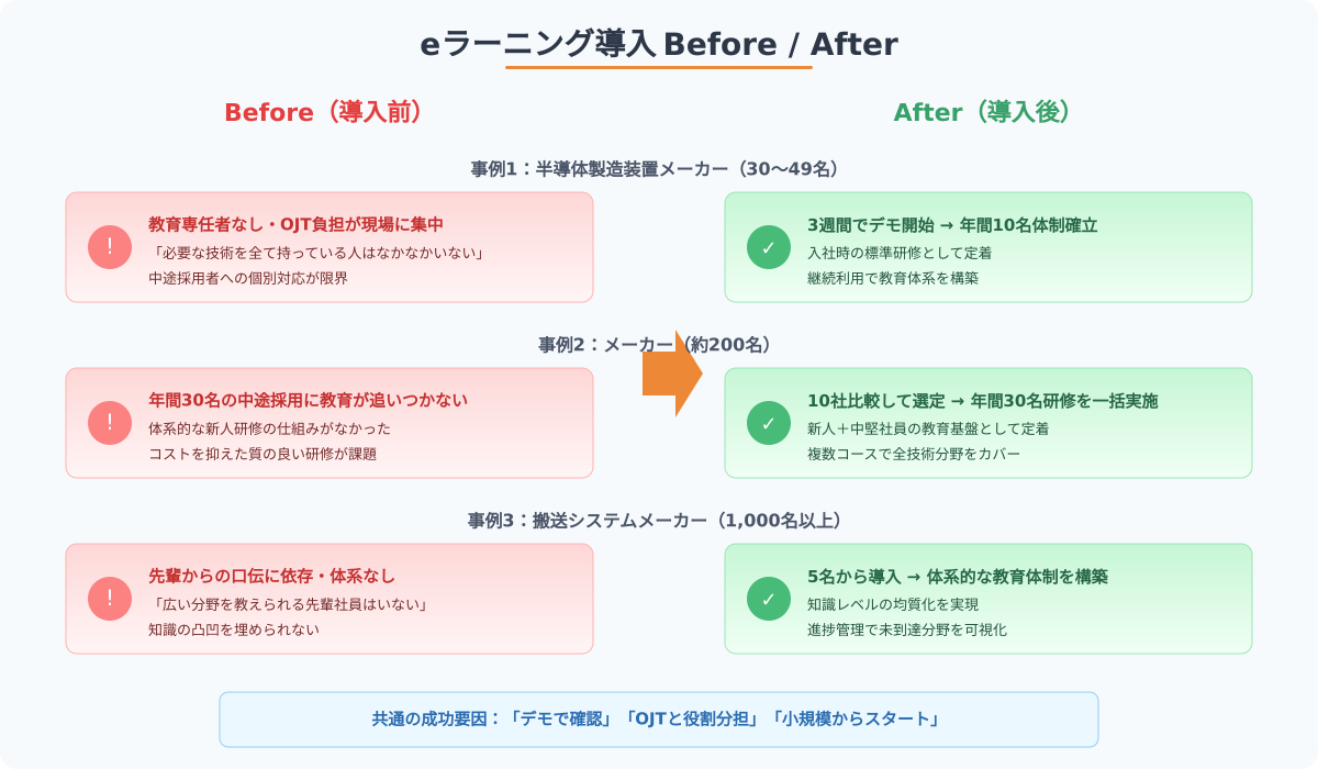 • eラーニングは「基礎」、応用は「OJTやメーカー講習」と役割分担する — すべてをeラーニングでカバーしようとしないことが重要です