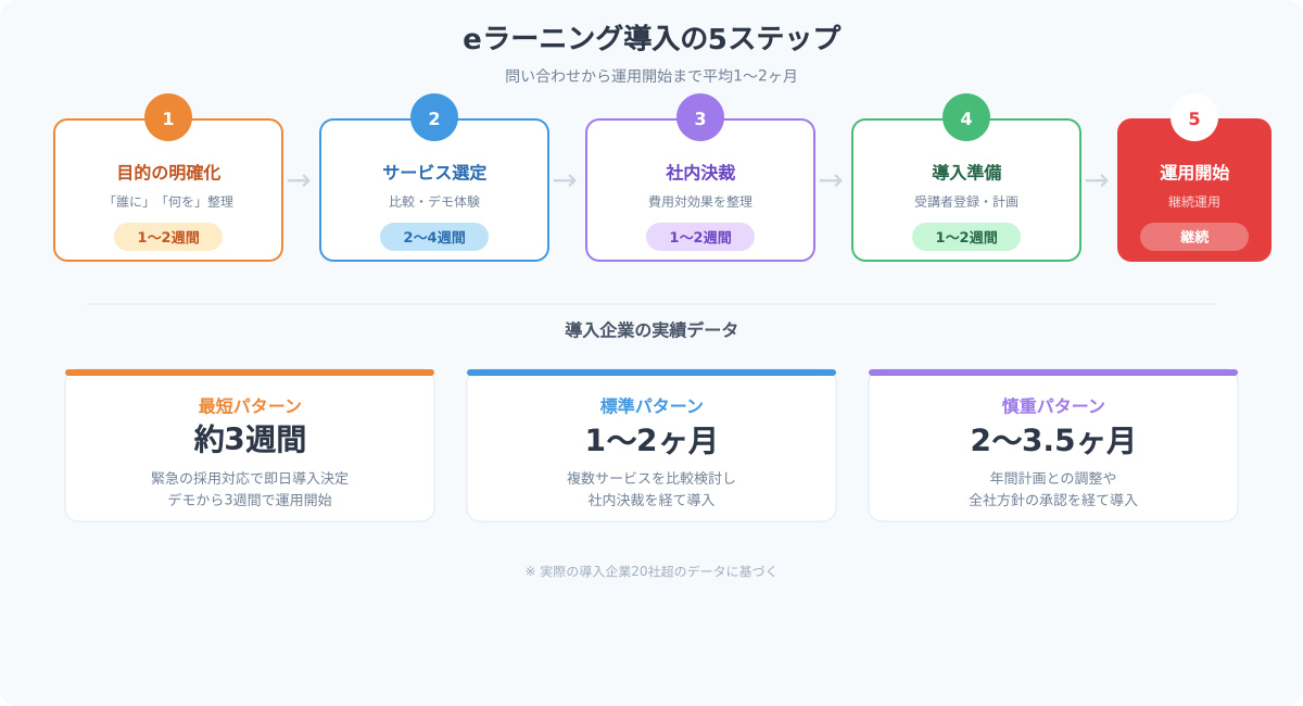 実際の導入企業のデータをもとに、検討開始から運用開始までの一般的な流れを紹介します。